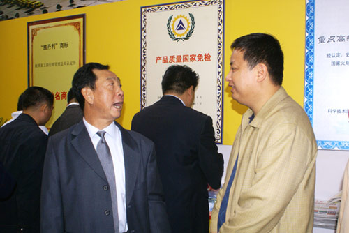 圖為中國磷復肥協(xié)會理事長武希彥(左一)在展會上與史丹利公司總經(jīng)理高進華親切交談